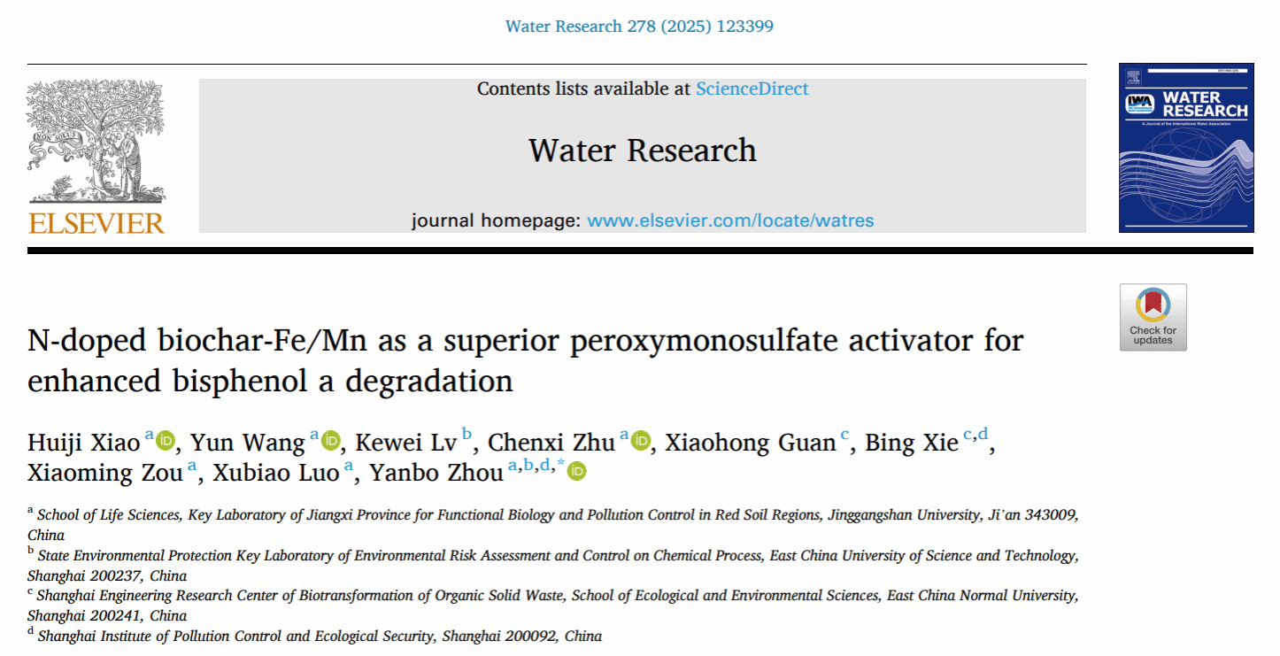 近日,我校周彦波教授团队在环境领域取得的重要研究成果“N-doped biochar-Fe/Mn as a superior peroxymonosulfate activator for enhanced bisphenol a degradation”成功入选最新一期ESI(基本科学指标)高被引论文和热点论文。该成果于2025年6月15日在环境科学与水研究领域国际顶级期刊《Water Research》(自然指数期刊,中科院一区TOP,IF2024 = 12.38)正式发表。论文以井冈山大学为第一单位,生命科学学院肖慧吉博士为第一作者,周彦波教授为通讯作者。