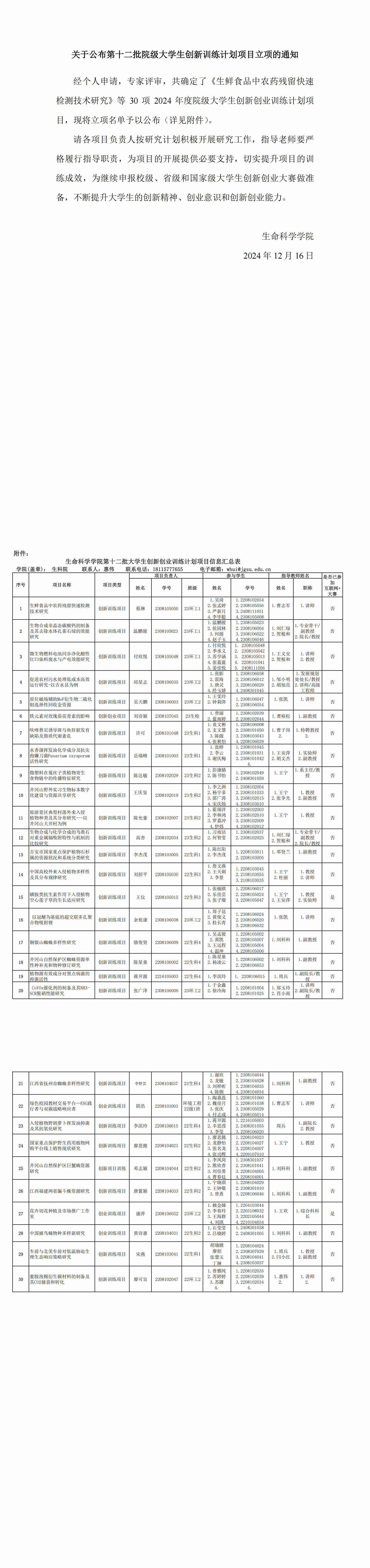 关于公布第十二批院级大学生创新训练计划项目立项的通知