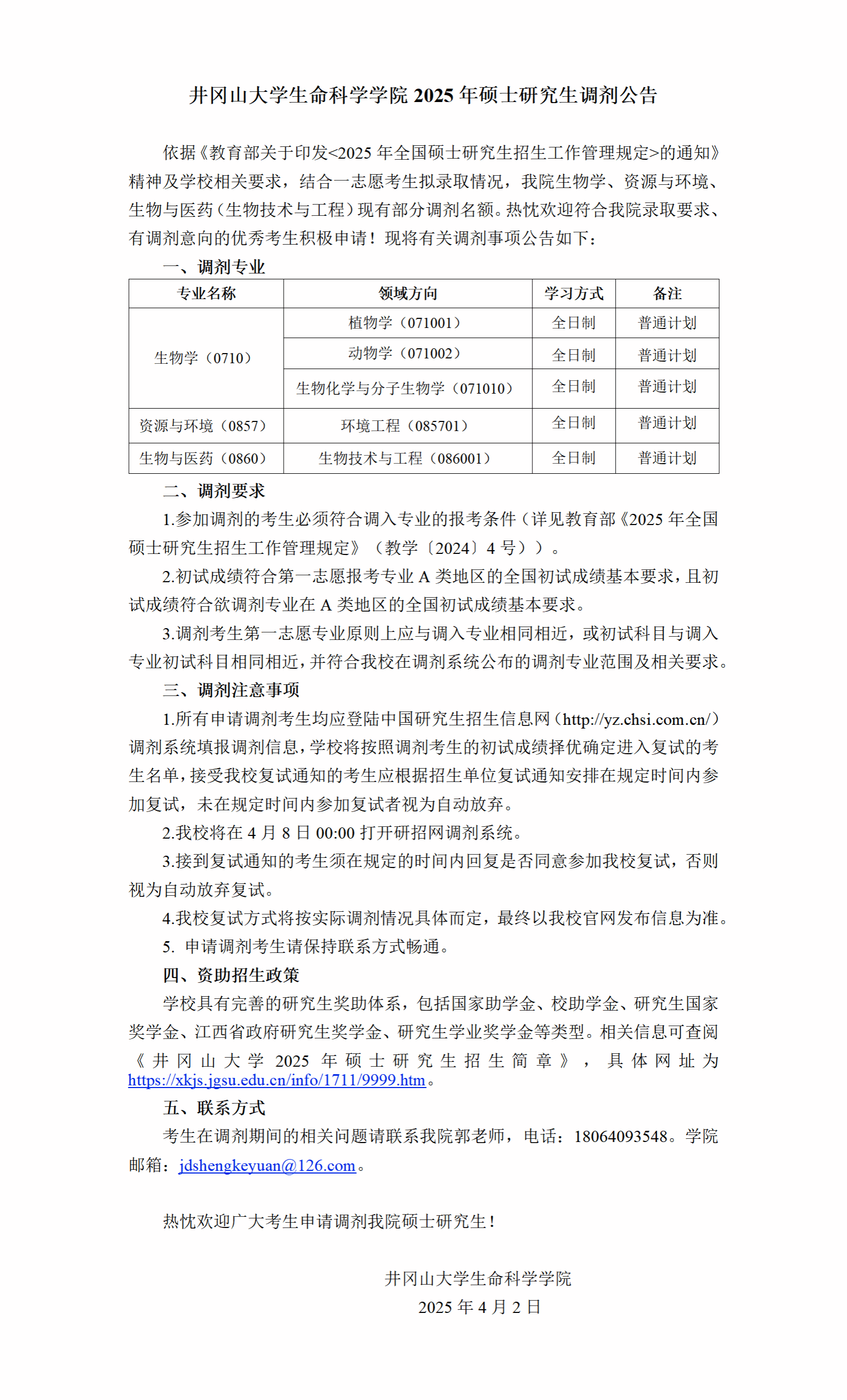 井冈山大学生命科学学院2025年硕士研究生调剂公告