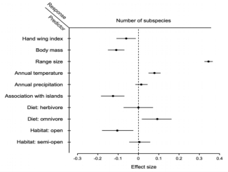 通过运用全球超过7000个鸟类物种的数据,探究亚种丰富度(亚种数来衡量)和扩散能力(手翼指数,hand-wing index)的关系。结果表明扩散能力与亚种数之间存在一个显著的负相关关系。