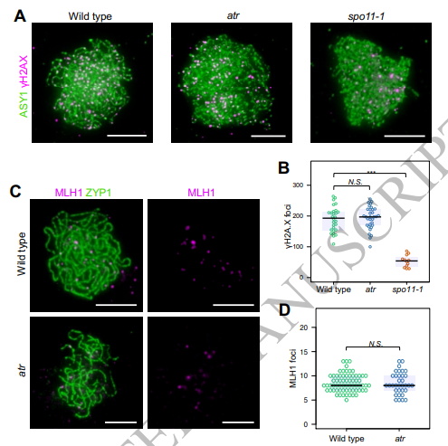 减数分裂交叉crossover,即减数分裂过程中染色体片段的相互交换,是遗传多样性的关键驱动因素。染色体的交叉是由程序性DNA双链断裂(DSB)引发的。虽然ATR激酶在DNA损伤信号传导中的作用是众所周知的,但其对交叉形成的影响仍未得到充分研究。