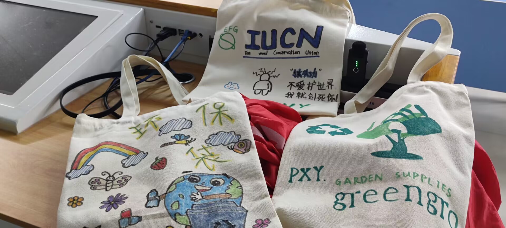 活动伊始,理事长曾小婷为大家分发帆布包和彩笔,同学们开拓思维,在购物袋上画上符合活动主题的图案。完成自己的帆布包设计后,同学们与自己的作品拍照留念并且拿回了自己设计的购物袋保存。最后,所有参加活动的人员一齐合照,活动结束。