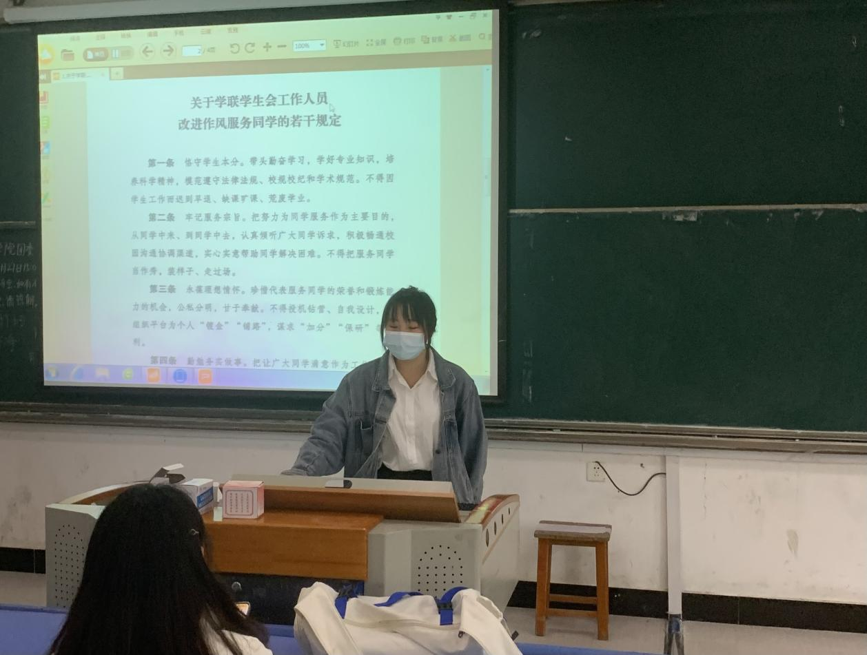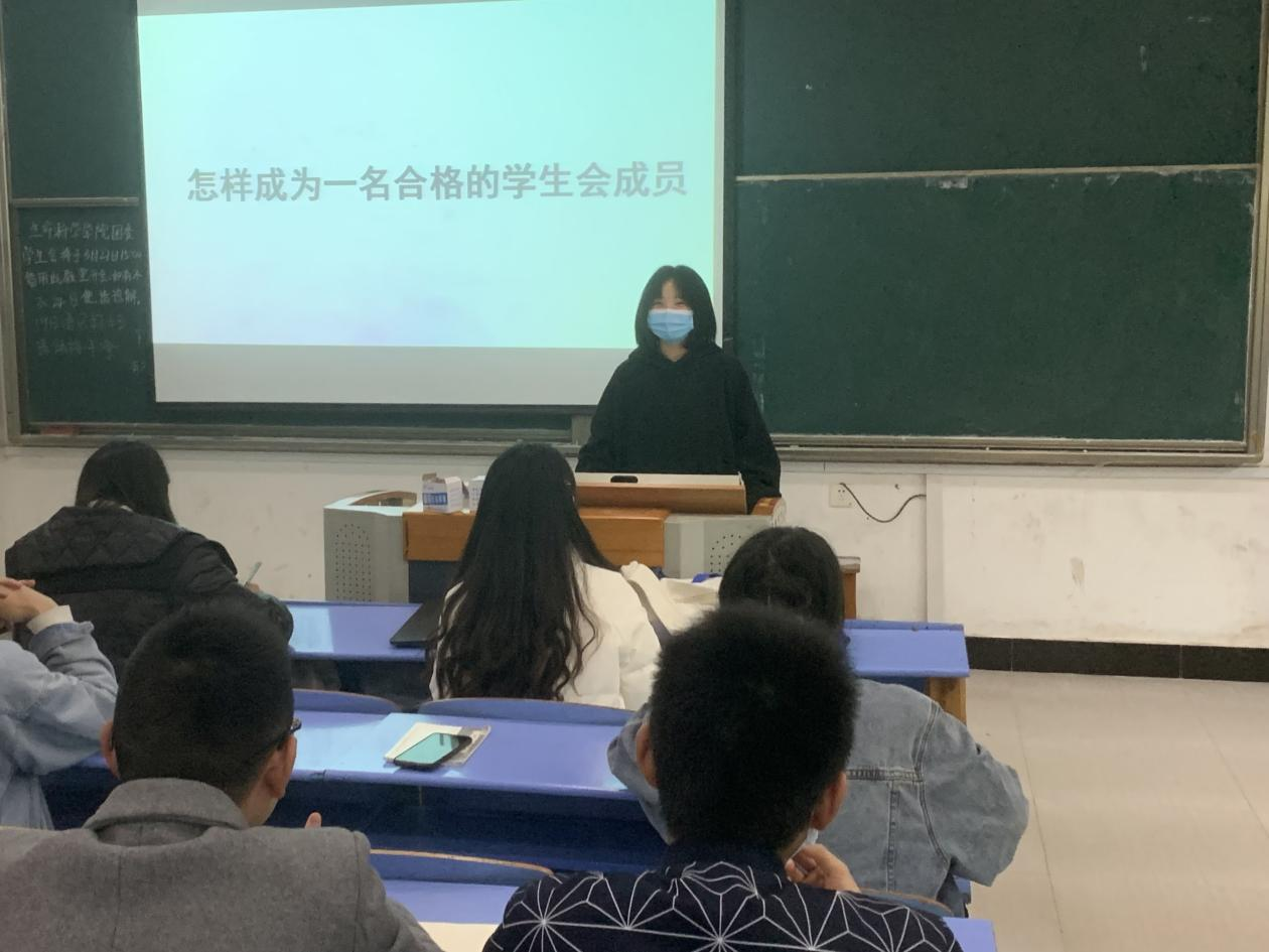 会上,周舒月就“怎样成为一名合格的学生会成员”这一问题向同学们进行阐述。首先,她提出作为学生干事应当恪守学生本分,学好专业知识。在繁忙的工作与学习中,也需永葆理想情怀,珍惜代表服务同学的荣誉和锻炼能力的机会。接着,她指出学生会成员必须勤勉务实做事,将让广大同学满意作为工作目标,要牢记服务宗旨,实心实意帮助同学。最后,她强调学生会应营造平等氛围,不得以学生“官”自居,摒弃这一庸俗习气。并鼓励大家努力建设充满朝气、干净纯粹的组织文化。
