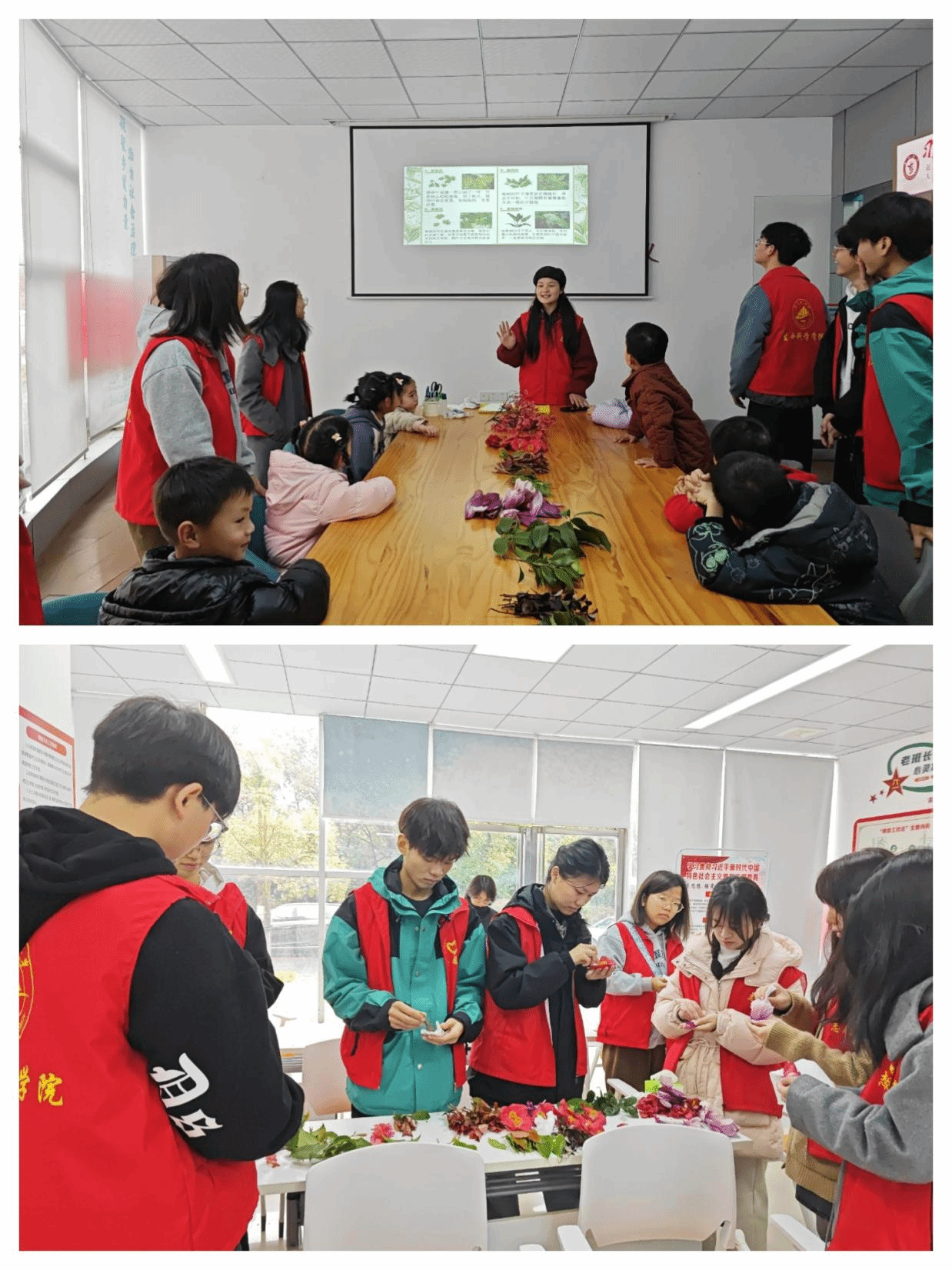 活动伊始,志愿者们抵达社区,着手筹备植物标本制作的必需材料。在此过程中,志愿者周佳怡通过精心准备的PPT讲解,向在场的小朋友们深入浅出地介绍了各种植物的相关知识。随后,志愿者们积极协助小朋友们动手制作各式各样的植物标本,以期通过实践操作,让他们对生物标本的制作有更深入的理解,同时也提升他们的动手实践能力,进一步激发他们对植物知识的热爱与兴趣。