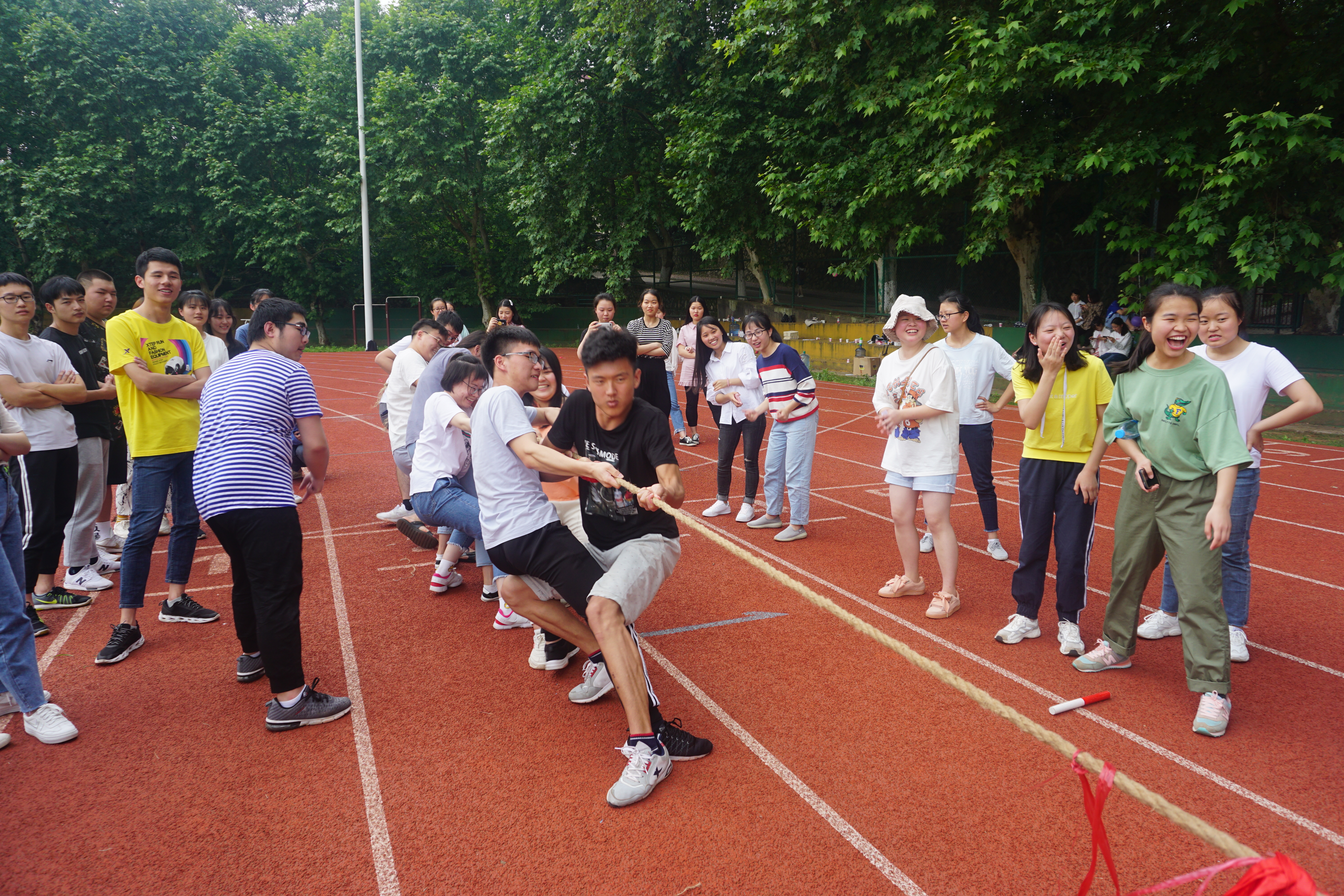 拓展活动过程中,各团队成员参加了点人成“树”、踩气球、游戏接龙、拔河等多个项目。特别是在“绑腿跑”项目中,每队的10名成员肩并肩、手挽手,集体喊着整齐的口号冲向终点。同学们在活动中互相配合,齐心协力,奋力争夺比赛的胜利,他们的拼搏精神、团队精神体现的淋漓尽致。