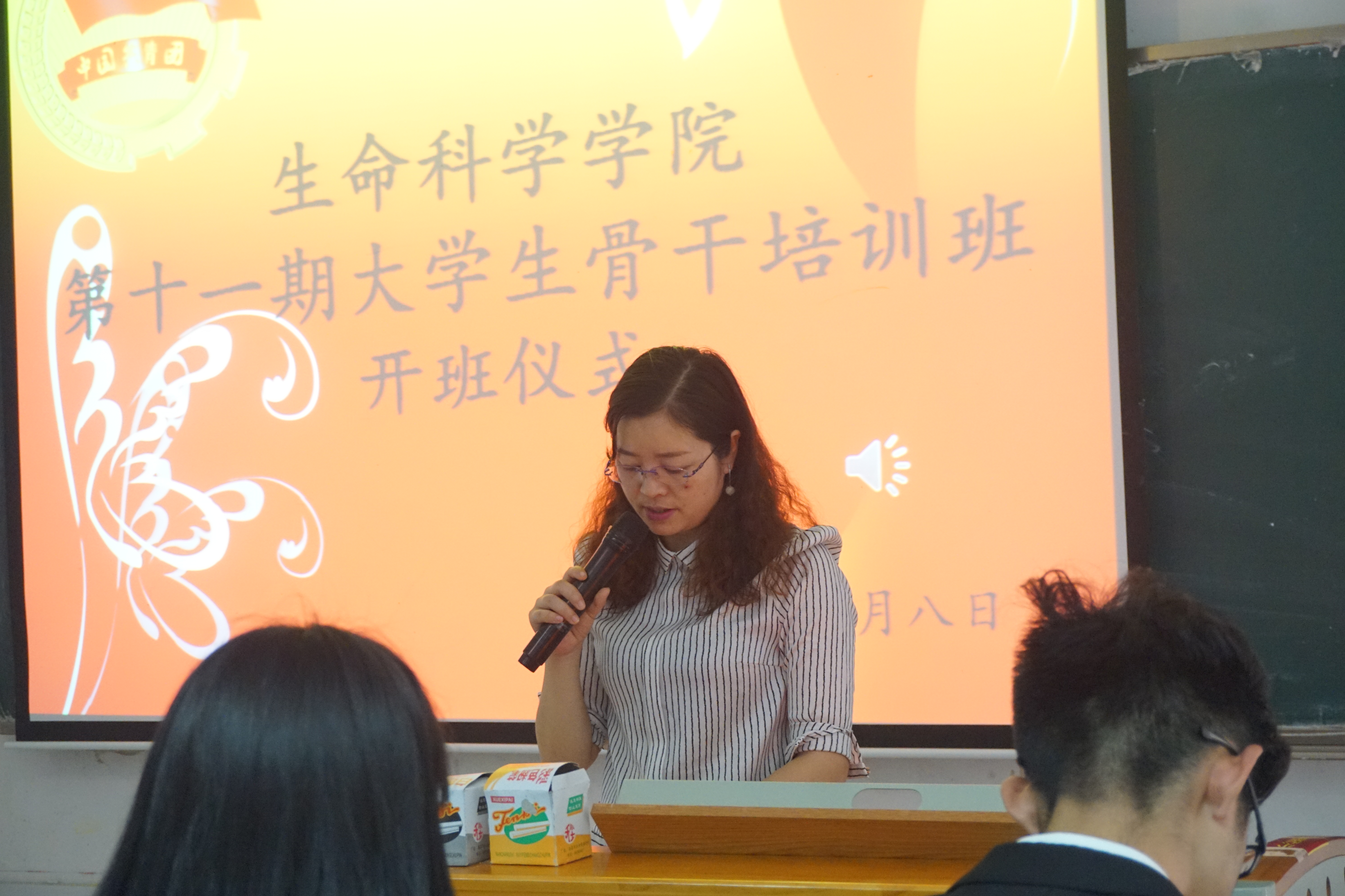 为深入学习贯彻党的十九大、团的十八大精神,让习近平新时代中国特色社会主义思想入脑入心,进一步提升学生干部的业务能力和专业素养,我院团委学生会于4月8日下午在九栋107教室顺利举行了生命科学学院第十一期大学生骨干培训班开班仪式。出席本次活动的有院团委书记吴丽花、学生科老师任梦雅以及60余名学员。仪式由任梦雅主持。