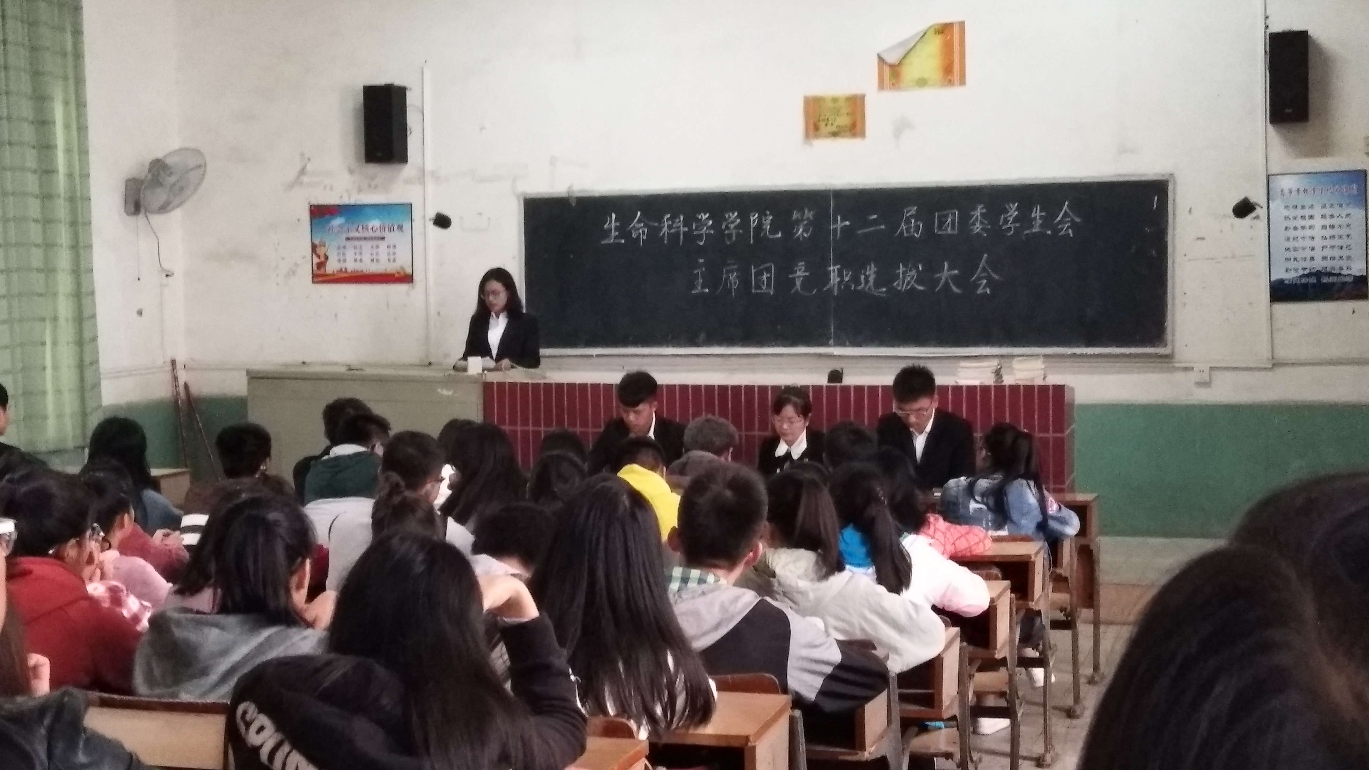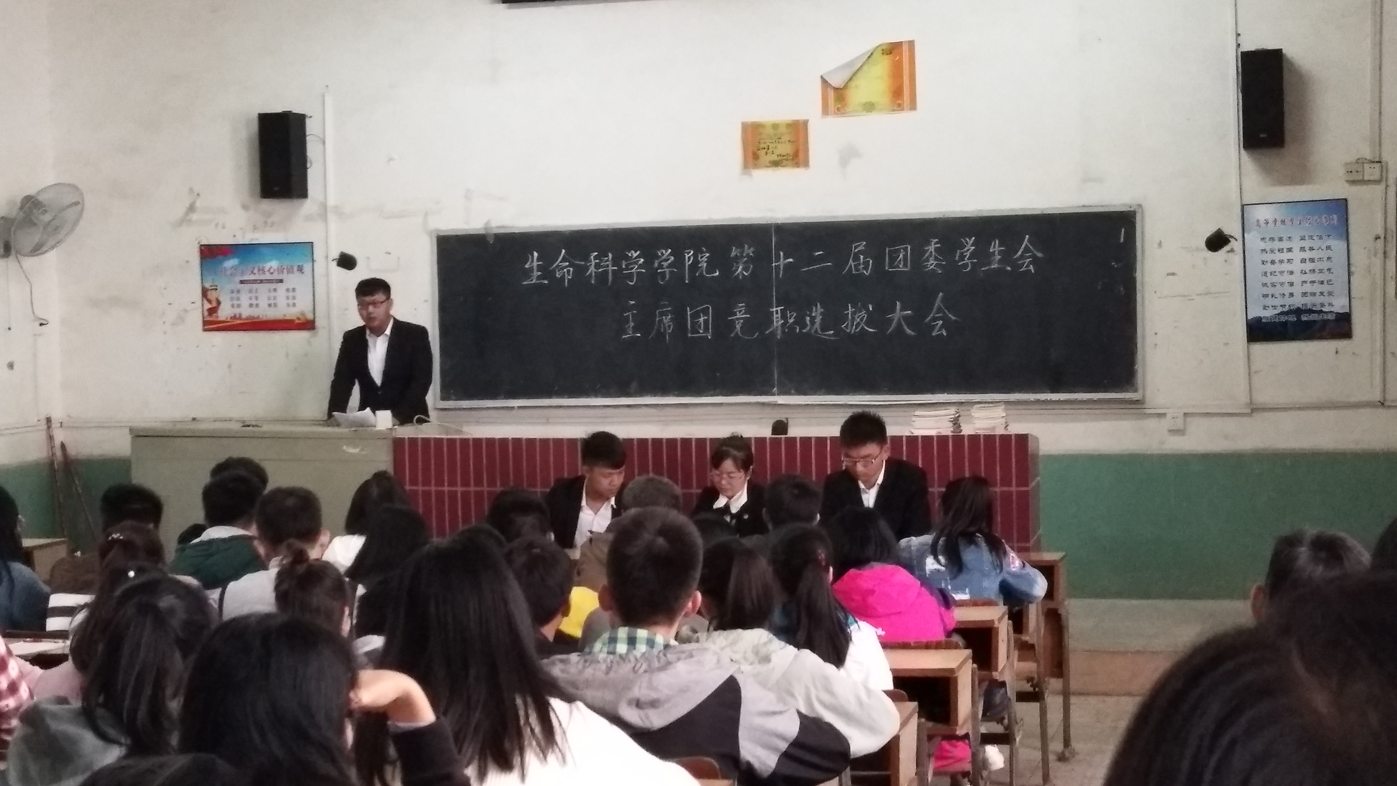 10月18日中午,我院在2栋209教室召开了第十二届团委学生会主席团竞职选拔大会。出席本次大会的有学院团委副书记吴丽花、学生团委副书记刘东生、学生会主席李松凌以及全院学生干部共计96人。大会由李松凌主持。