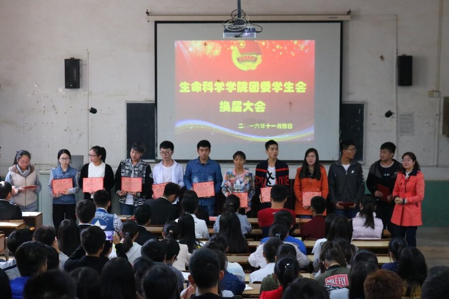 吴丽花老师首先对第十届学生干部的工作进行了详细的总结,并就取得的成绩给予了充分的肯定和赞扬。随后,对新上任干部提出新的要求和希望。她要求学生干部第一要提高政治素质和业务能力;第二要培养团队意识和协作精神;第三要坚持原则,树立服务意识;第四要准确定位,明确职责;第五要正确处理好学习与工作的关系。新一任的学生干部谨记要求,受益颇丰。随后,学生团委副书记陆超宣读了我院第十一届团委学生会主要负责人名单,新一届团委副书记刘东生、学生会主席张条、学生会副主席李松凌分别就工作设想和个人职责进行了就职说明。学生会主席杨颢宇就上一届的工作做了详细的报告并希望新一任干部能够勿忘初心,砥砺前行。在吴老师为第十届学生干部颁发聘书后,全体学生会成员庄严的宣读了誓词,换届大会圆满结束。