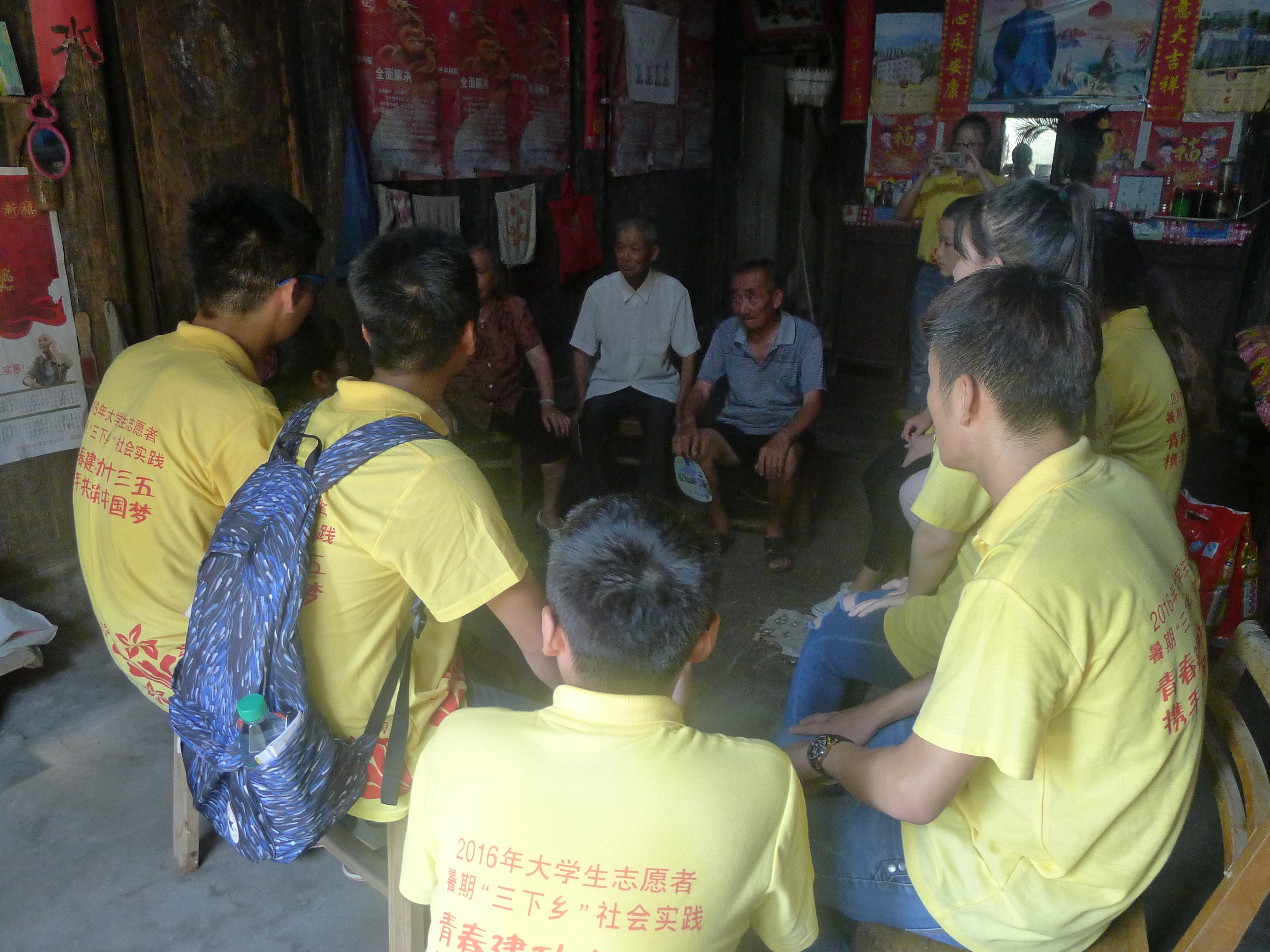 实践团在兴桥镇虎溪村委会肖世荣主任的陪同下,来到了近二百年历史的一栋老屋中,与三位孤寡老人亲切地围坐畅谈。通过交流,队友们了解到了老人们的身体和生活状况。三位老人虽都已上80岁,身体却非常硬朗。他们对党和政府的老有所养的好政策心存感激,老人告诉队员们,他们不但享有医保,还每月领取生活补助。村里的老人都给办了老人公交卡,坐公交上市区逛逛街非常方便。近两个小时的欢快交流让整个老房子充满了欢声笑语,最后,队员们为三位老人送上了大米、洗衣粉等慰问品,并帮助他们打扫屋舍。