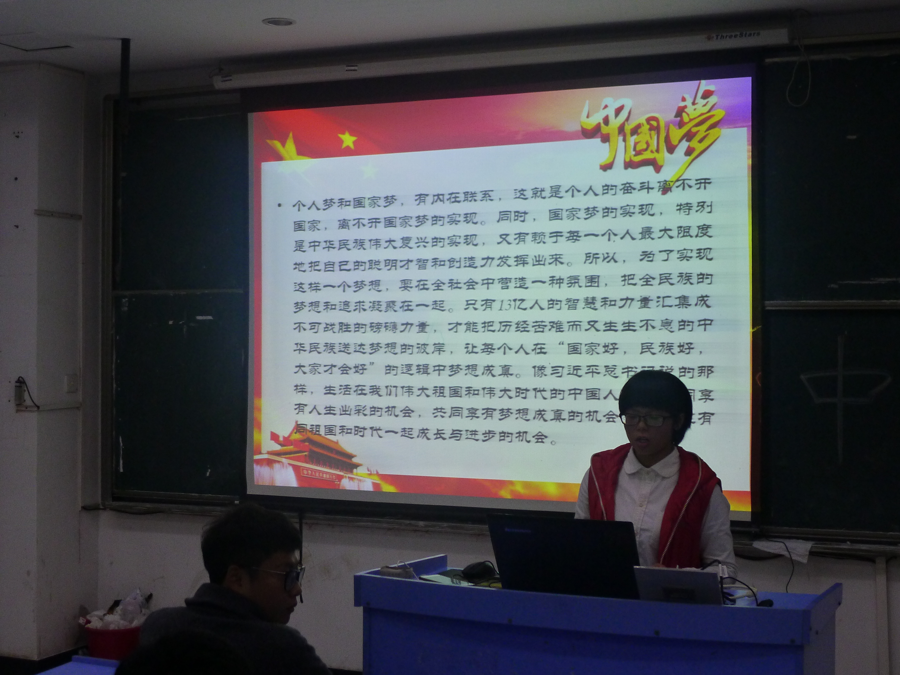 活动从观看“青春中国志,腾飞中国梦”主题的PPT开始,继以播放视频、口头讲解等多种方式让同学们了解到新中国的蓬勃发展,激发同学们对伟大祖国的敬爱之情。网信部程昕带领同学们学习“中国梦”,了解“中国梦”提出的背景,并呼吁同学们认清“中国梦”的实际情况,明白“中国梦”与“个人梦”的联系,借鉴“美国梦”来圆“中国梦”,引导广大青年为实现伟大“中国梦”而奋斗。最后,由同学们各自讲述对“中国梦”的理解,互相交流各自的感悟,并畅谈各自的理想抱负,展现出当代青年学生积极向上的良好精神风貌。