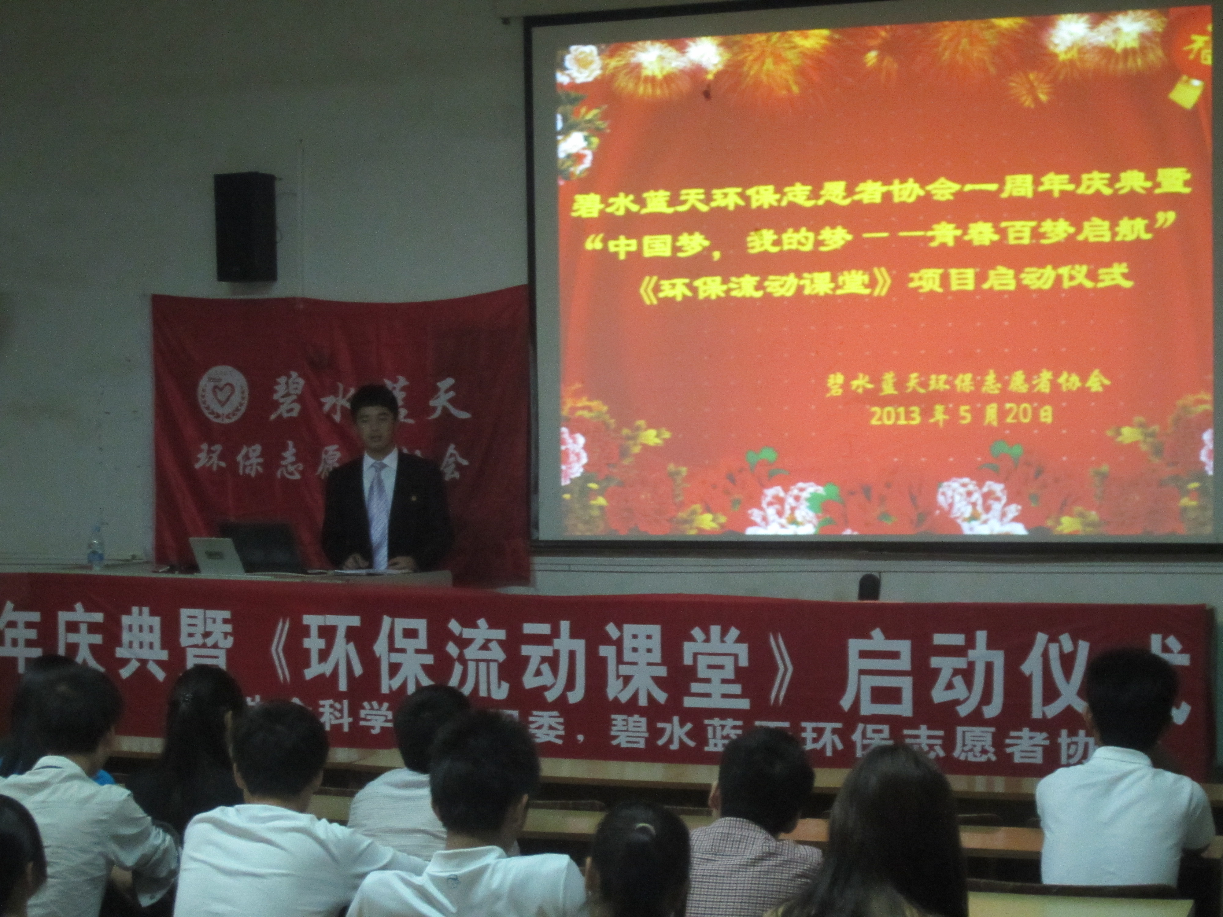 5月20日,我院碧水蓝天环保志愿者协会在2栋教学楼209教室举行了协会一周年庆典暨《环保流动课堂》项目启动仪式。活动由协会理事长李加斌主持,协会全体成员参加。