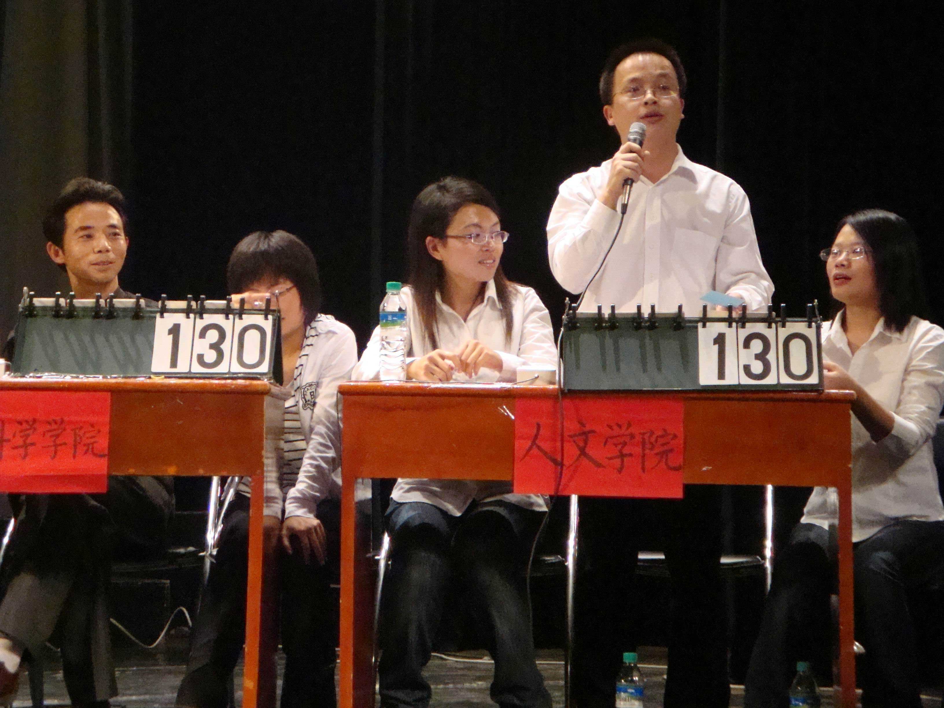 10月29日下午,旨在“弘扬传统文化,增进爱国情感”的我校“师生庐陵文化知识大赛”决赛在音乐厅隆重举行。参加决赛的六支代表队是在10月20号经过预赛产生的,由朱焕明老师、曾斌昌和杜晓芳二同学组成的我院代表队以预赛第二的成绩进入到本次决赛,与人文学院、教育学院、政法学院、艺术学院、信息科学与传媒学院展开角逐。大赛分个人必答,小组必答,抢答和风险题回答四个环节,其中的抢答环节最为引人注目,而风险题回答把大赛氛围推向紧张的高潮。在三名队员的齐心协力下,我院以165的总分位列第三,人文学院和教育学院分别以195和170的分数分获一、二名,信息科学与传媒学院、政法学院、艺术学院分获四、五、六名。