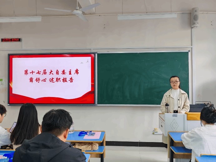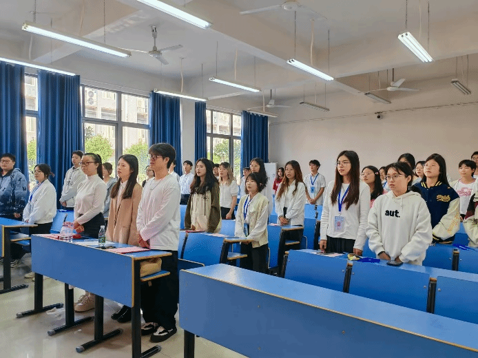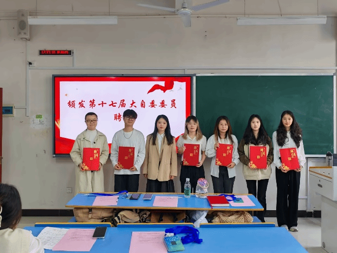 会议伊始,参会人员全体起立奏唱国歌。第十七届自律委员会主席薛舒心对上一学年的工作进行了全面且深刻的总结,她回顾了过去一年在寝室卫生检查、学风建设、学生日常行为规范引导等方面所取得的成绩,同时也指出了工作中存在的不足,并对下一届委员会发展提出了改进措施。第十八届大自律委员会主席黄艳在任职报告中分享了自己的工作经验,并表示将带领新一届委员会成员继承和发扬上一届的优良传统,不断改进工作方法,表达了为同学们办实事的坚定决心以及对未来工作的愿景与建议。此外,会上开展了聘书颁发、工作牌交接和学生干部宣誓环节。