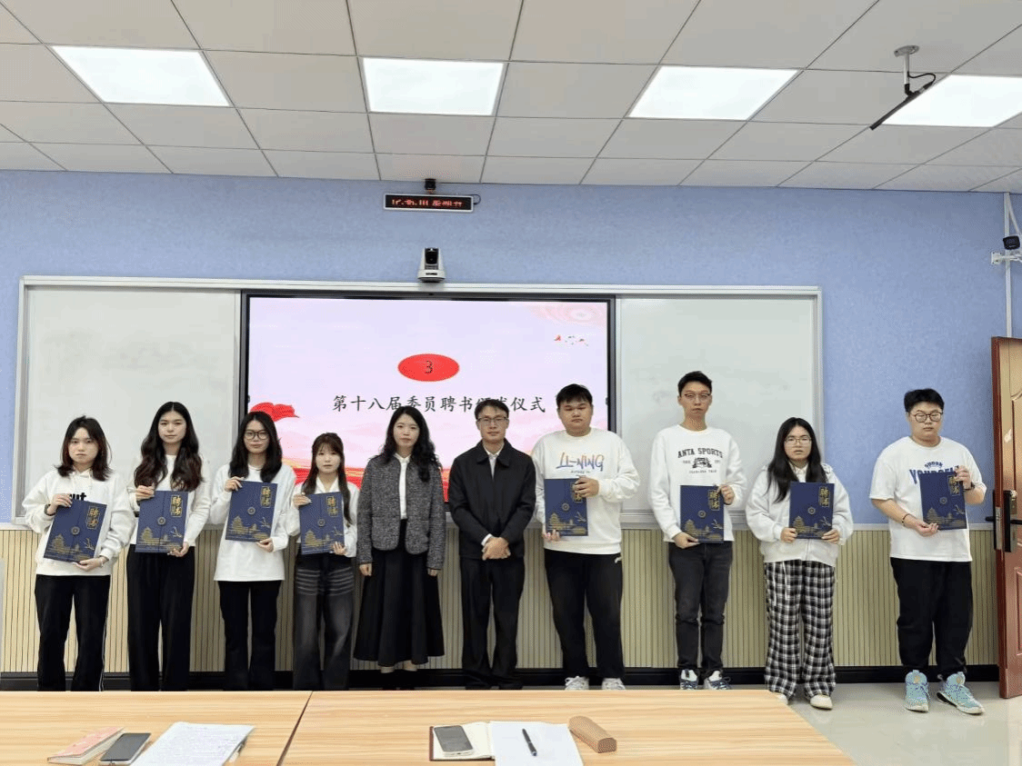 其次,肖虹、黄世旺老师为第十八届委员颁发聘书,以表彰他们在过去一年中的辛勤付出。紧接着,大会进行第十八届委员与第十九届委员的工作牌交接仪式。薪火相传,使命交接,相信在第十九届委员的带领下,大自委必将迈上新的台阶。