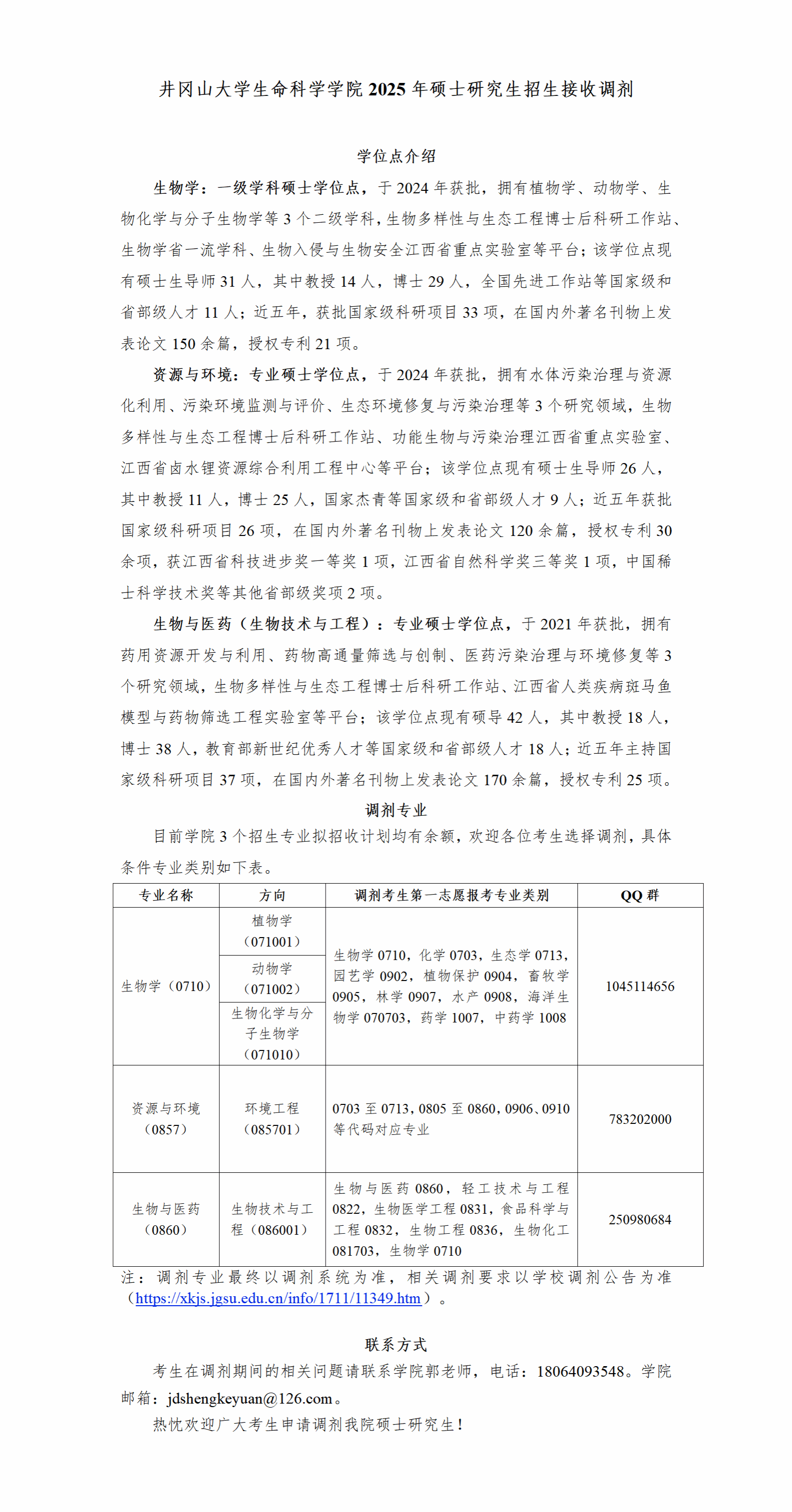 井冈山大学生命科学学院2025年硕士研究生招生接收调剂