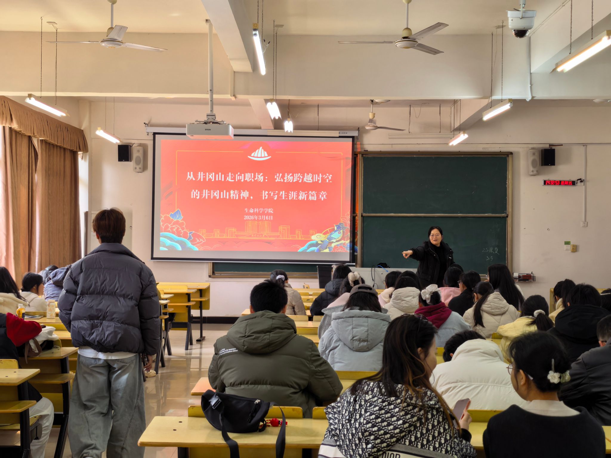 课堂上,何旭梅结合当前就业形势与相关专业领域的行业前景,进行了深入的分析与动员。她强调,作为新时代的毕业生,不仅要具备扎实的专业技能,更要有坚定的理想信念。井冈山精神是井大学子最宝贵的精神财富。在即将到来的职场生涯中,同学们会面临各种挑战和诱惑,希望大家能把“坚定执着追理想、实事求是闯新路、艰苦奋斗攻难关、依靠群众求胜利”的井冈山精神装进行囊,将个人职业发展融入国家富强和民族复兴的伟大进程中,以艰苦奋斗的作风攻克职场中的“娄山关”“腊子口”。