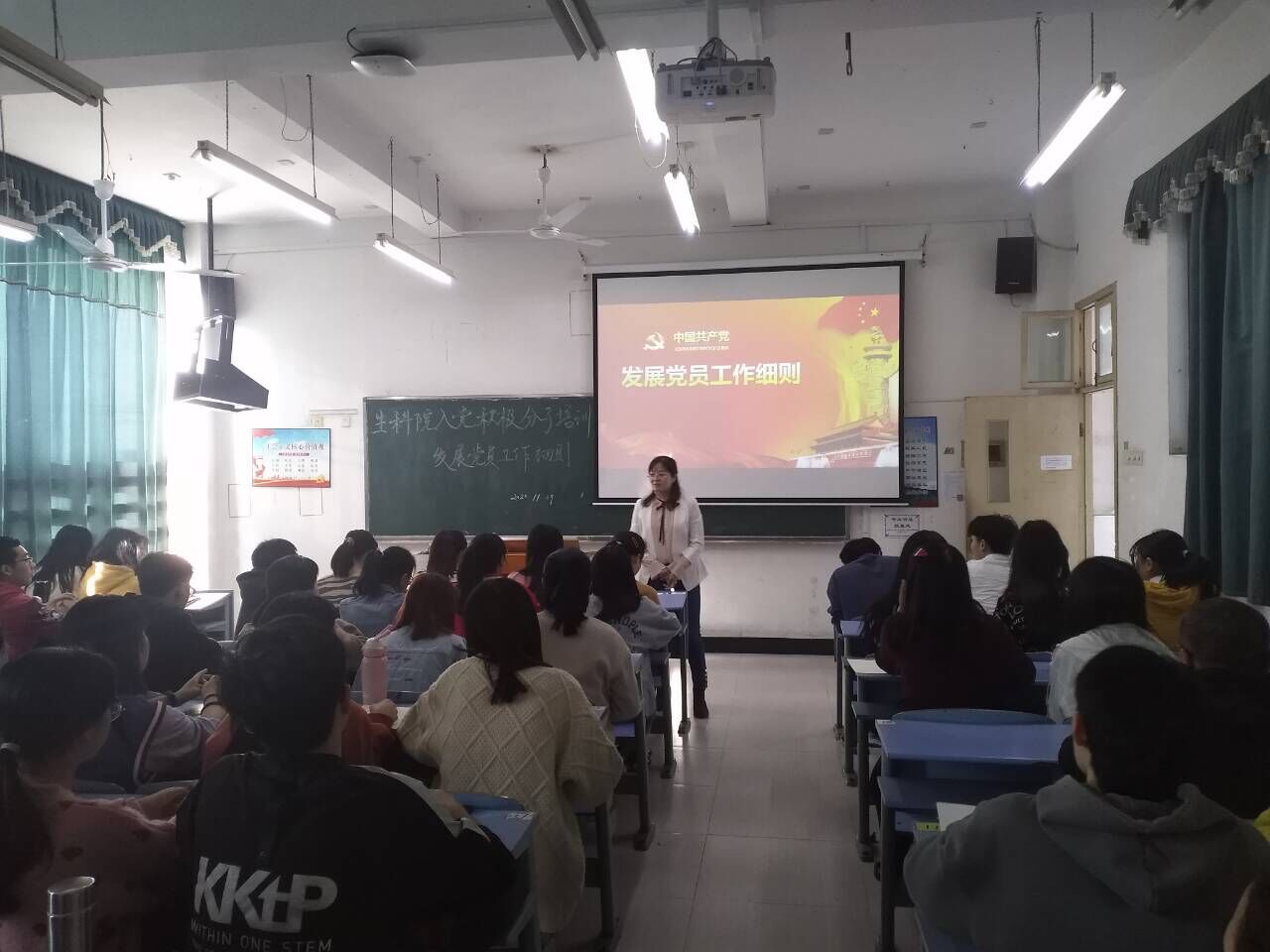 11月9日上午,生命科学学院入党积极分子培训于9栋201教室举行,学生党支部书记给同学们上了一堂题为“发展党员工作细则”的专题党课,全体生科院入党积极分子培训班成员参会。