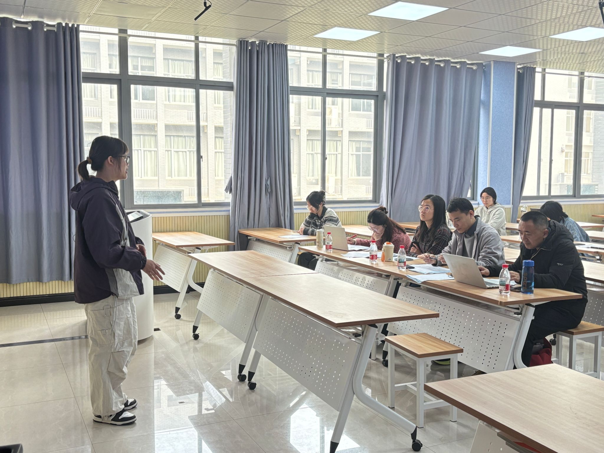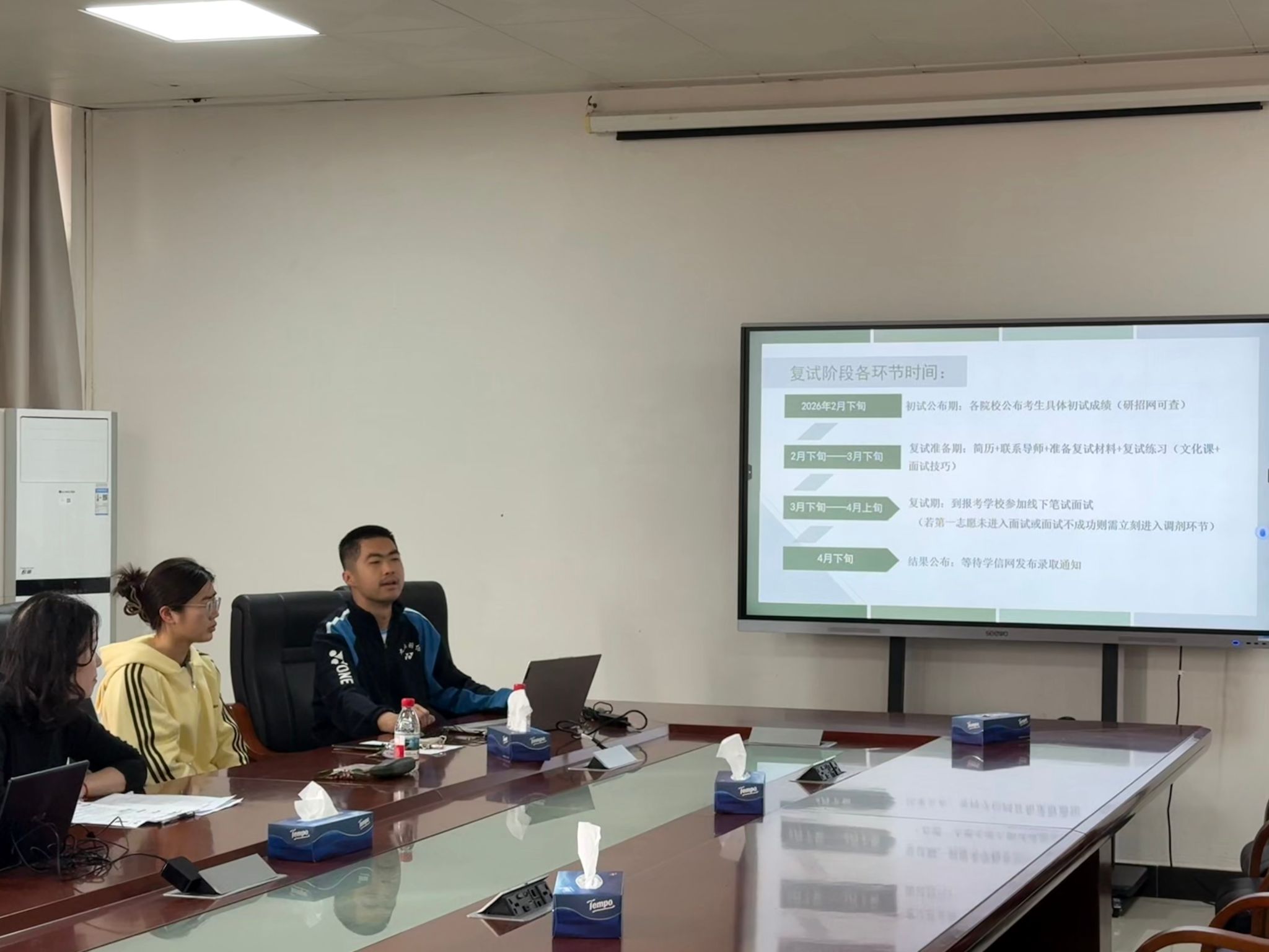 学院整合优质师资与在读研究生资源,为复试考生打造多维度、沉浸式的指导服务。一方面,组织专任教师组建考研复试导师团队,结合学科差异开展针对性专业课指导;考研帮扶先锋队的优秀在读研究生分享上岸实战经验,拆解资格审查、笔试、面试、体检全流程注意事项,面试礼仪、英语听说技巧,指导考生优化简历、个人陈述等复试材料。另一方面,开展小组式全真模拟面试,围绕专业知识问答、综合能力测评、科研潜力考察等复试核心环节进行全流程实战演练,模拟面试结束后,导师团队现场精准点评作答问题、指出备考短板,针对性给出答题思路优化建议,帮助考生快速查漏补缺,切实提升临场应变能力与复试应试水平。同时,先锋队建立线上 + 线下常态化答疑机制,线下提供预约式一对一专业课咨询、简历修改等服务,线上通过答疑群实时解惑,还为考生提供心理疏导,缓解备考焦虑。